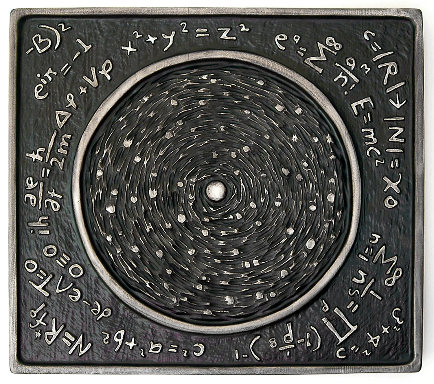 When Scientist were asked to describe a formula that represented the Beauty of the Universe, the equations in this piece were their answers. As a Symbolist, my answer is the circle (representing totality) with a center (representing Source) and stars that represent the Cosmos.