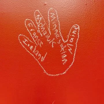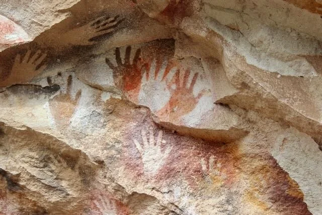 Hand prints have been discovered in caves and cliff walls all over the world, dating back to the Paleolithic era. The oldest one, found in Indonesia, is about 67,800 years old. Researchers have concluded that 25% of these hand prints and stencils were made by young children. What did they mean? I believe making a hand print was a way of saying, “I’m here,” “We were here,” and “This is our community.”