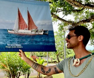 Tahiarii took us to a sacred ceremonial site and explained how, from this island, his ancestors, in homemade outriggers, made their way to New Zealand, Rapa Nui (Easter Island), and Hawaii. He reconnected with Elders who still held knowledge of sailing and navigating. After three years in training, Tahiarii navigated, in a replica of an original outrigger, from New Zealand back to Raiatea.